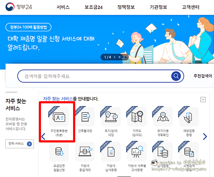 만약 정부24를 선택해서 들어왔다면 홈페이지 메인화면에 자주찾는 서비스 안내 밑에 '주민등록등본(초본)'을 선택한다.