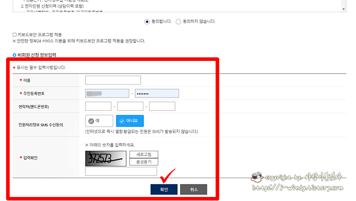 비회원 신청 시 이름, 주민들옥번호, 연락처, 보안숫자 등을 추가로 입력한 뒤 확인을 눌러준다.
