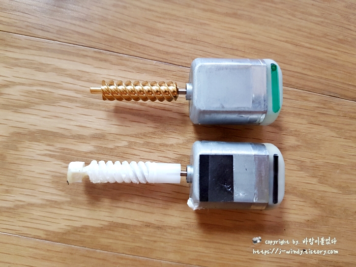 모터의 나사산이 황금색으로 되어있는것이 이번에 새로 구입한 신형모터이고 하얀플라스틱이 부착되어 있는 것이 구형 모터이다. 모터의 길이가 달라서 호환이 될까 걱정스럽기도 하겠지만 기존의 문제점들을 보완해 출시된 제품이니 걱정말고 교체해주자.