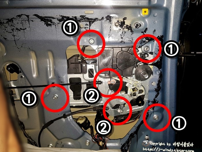 손이 들어갈 공간도 부족하고 어두운 곳이기 때문에 작업 여건이 좋지 않지만 위 사진을 참고해 1번 부터 때어낸 후 2번의 와이어를 홈 구멍을 확인해가면서 비틀면서 빼내어 보자. 와이어 빼는 것에 성공했다면 도어 액츄에이터 본체를 좁은 구멍틈으로 조심히 빼내도록 한다.