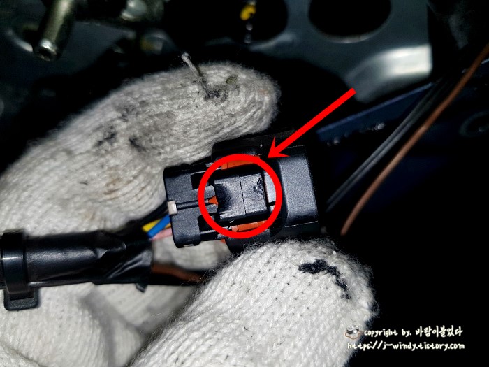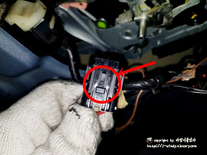 도어 액츄에이터 아래쪽에는 2개의 전원커낵터가 연결되어 있다. 커넥터를 힘으로 빼내려고하면 절대 빠지지 않는다. 커넥터 가운데 부분을 손가락으로 눌러보면 미세하게 들어가는 것을 확인할 수 있는데 이 부분을 눌러주면서 빼내면 쉽게 빼낼 수 있다. 처음에는 이 작업도 어렵고 힘들 수 있지만 요령껏 빼내보기 바란다.