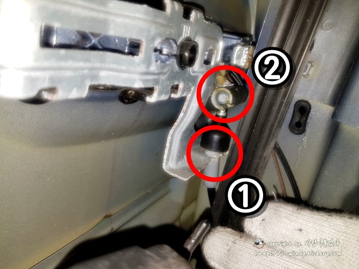 위 사진은 2열 오토슬라이딩도어의 손잡이 뒷 부분이라 할 수있다. 도어 액츄에이터의 와이어가 이 곳에도 연결이 되어있기 때문에 해체해 주어야지 도어 액츄에이터를 바깥으로 끄집어 낼 수가 있다.