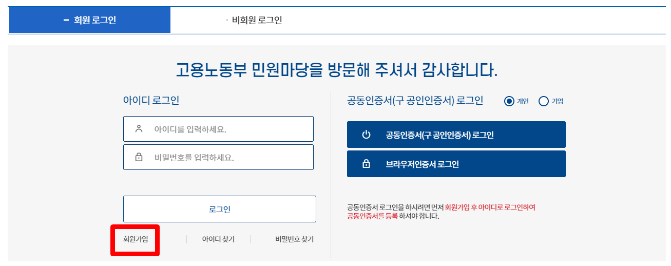 고용노동부 민원마당을 이용하기 위해서는 회원가입이 필요하다. 비회원으로도 사용은 가능하지만 회원가입을 해놓는 것이 나중에 내가 신청한 민원에 대한 진행사항 확인도 수월하기 때문에 회원가입을 추천드린다.