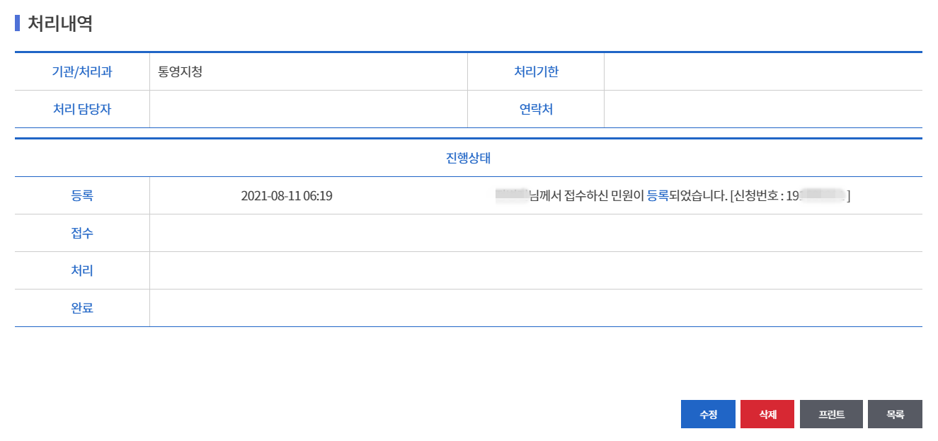 내가 등록한 민원이 제대로 접수가 되어있는지는 나의 민원에서 확인이 가능하다.