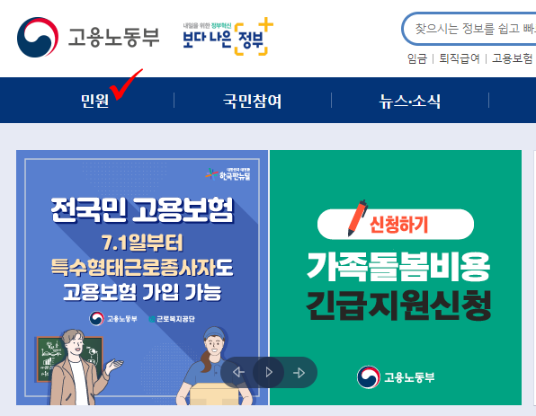 고용노동부 홈페이지에 접속하면 메뉴 아래로 커다란 배너에 '가족돌봄비용 긴급지원신청'이 보인다. 배너는 시간에따라 슬라이드 되니 안보일 수도 있는데 그럴 땐 메뉴에 '민원'을 선택하도록 한다.