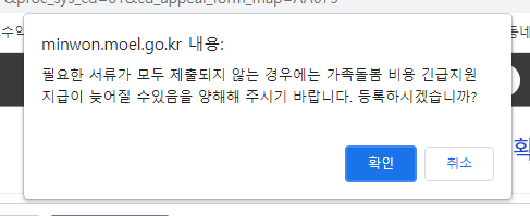 "필요한 서류가 모두 제출되지 않는 경우에는 가족 돌봄 비용 긴급지원 지급이 늦어질 수 있음을 양해해 주시기 바랍니다. "