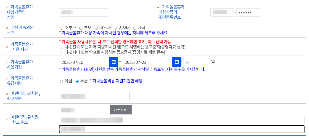 가족돌봄휴가를 사용하게된 대상가족의 이름과 주민등록번호를 입력한다. 8살 아들2호의 이름과 주민번호를 입력하고 가족돌봄휴가 사용기간, 유급/무급 유무, 학교 명칭, 학교 주소를 입력해주었다.