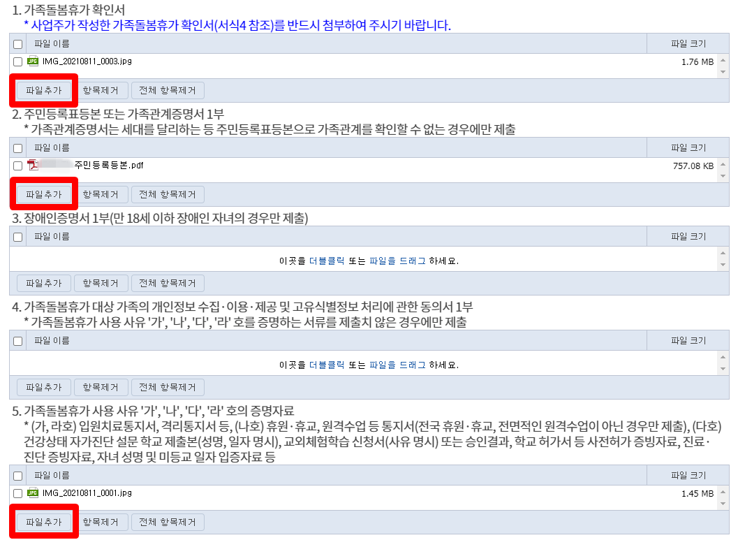 이제 내가 발급받은 가족돌봄휴가 확인서, 주민등록등본, 결석확인서를 첨부해야 할 시간이다. 메뉴에 해당하는 첨부파일을 하나씩 업로드해주자.