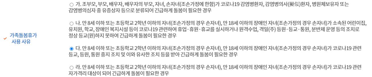 가족돌봄휴가 사용사유는 총 4가지를 선택할 수 있다. 해당 설명에 가장 들어맞는 것을 선택하면 되는데 나의 경우 등원 중지 조치를 받았기 때문에 세 번째 '다'를 선택했다. 잘 이해가 가지 않는다면 적당한 것을 선택해도 무방하다. 신청서 접수가 완료되고 담당자가 배정되면 담당자와 전화 연락을 하게 되는데 그때 나의 상황을 제대로 다시 설명해도 아무런 문제가 없어 보였다.