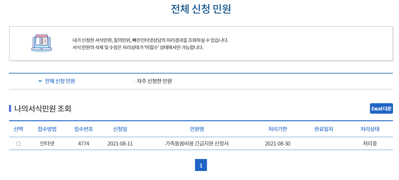 민원명은 가족돌봄비용 긴급지원 신청서이고 현재 처리중으로 나와있다. 등록일은 2021년 8월 11일이고 처리기한은 8월 30일까지이다. 잠시후에는 민원이 등록되었다는 문자메시지도 수신이된다. 이 기간을 다 채우지 않고 빨리 돈이 입금되기를 바란다.