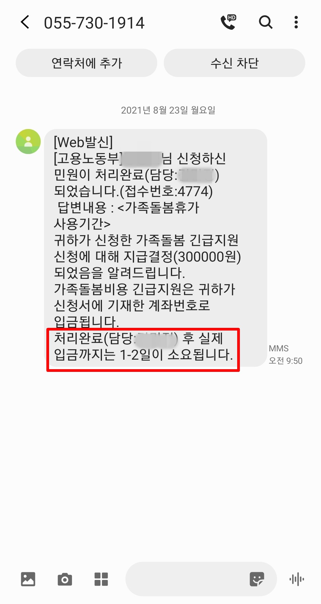 "귀하가 신청한 가족돌봄 긴급지원 신청에 대해 지급결정(300000원)되었음을 알려드립니다. 가족돌봄비용 긴급지원은 귀하가 신청서에 기재한 계좌번호로 입금됩니다. 실제 입금까지는 1~2일이 소요됩니다."